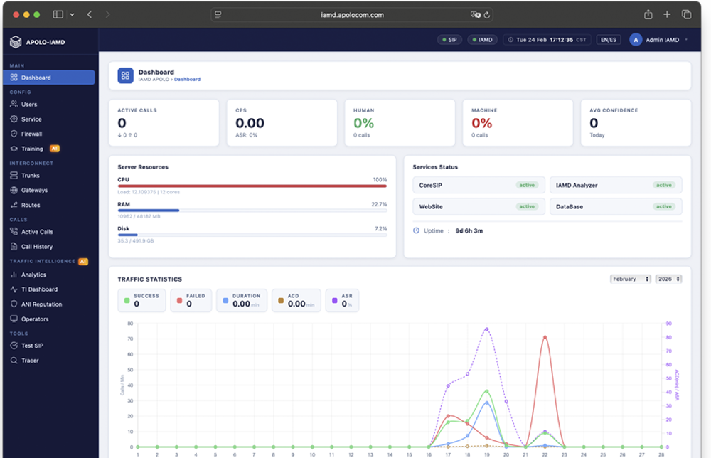 IAMD APOLO PLATFORM analyzes every inbound call in less than 100ms, identifying automatic dialers, evaluating ANI reputation and classifying traffic per operator using Machine Learning models trained with your own data.